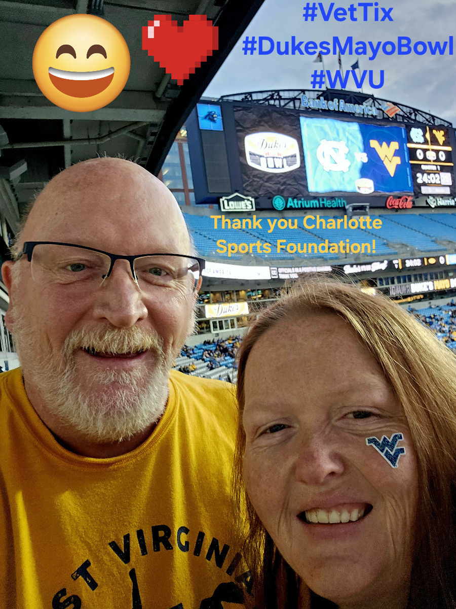 Thank you to the Charlotte Sports Foundation for the tickets through Vet Tix to attend the Duke's Mayo Bowl. From the moment we arrived in the Queen City everybody was friendly. The staff at the stadium we're so professional with genuine smiles on every face. We are already making plans to return to catch an NFL game and a soccer game in 2024. #CharlotteSports #VetTix #DukesMayoBowl #WVUfootball #USArmy #Veteran