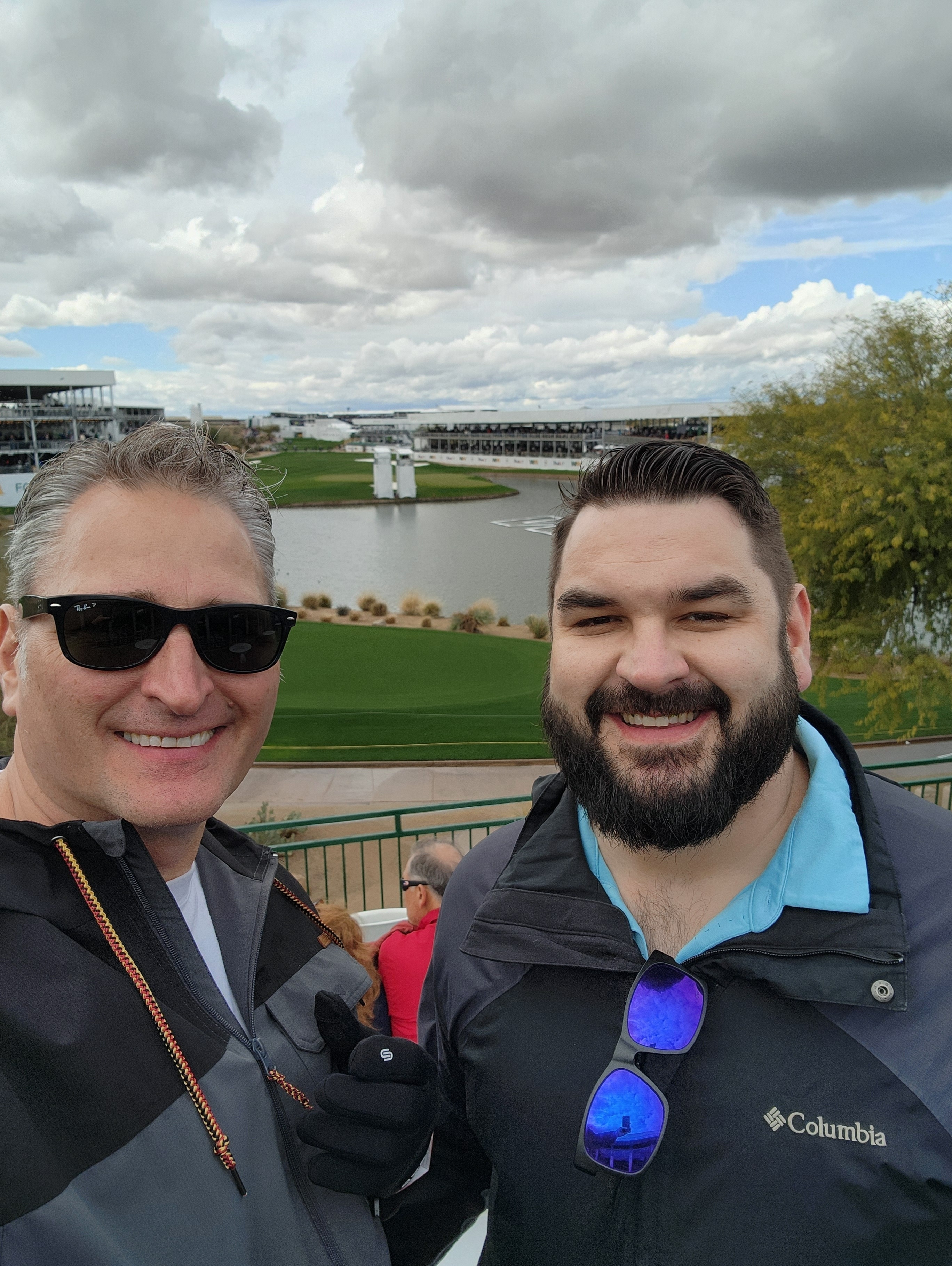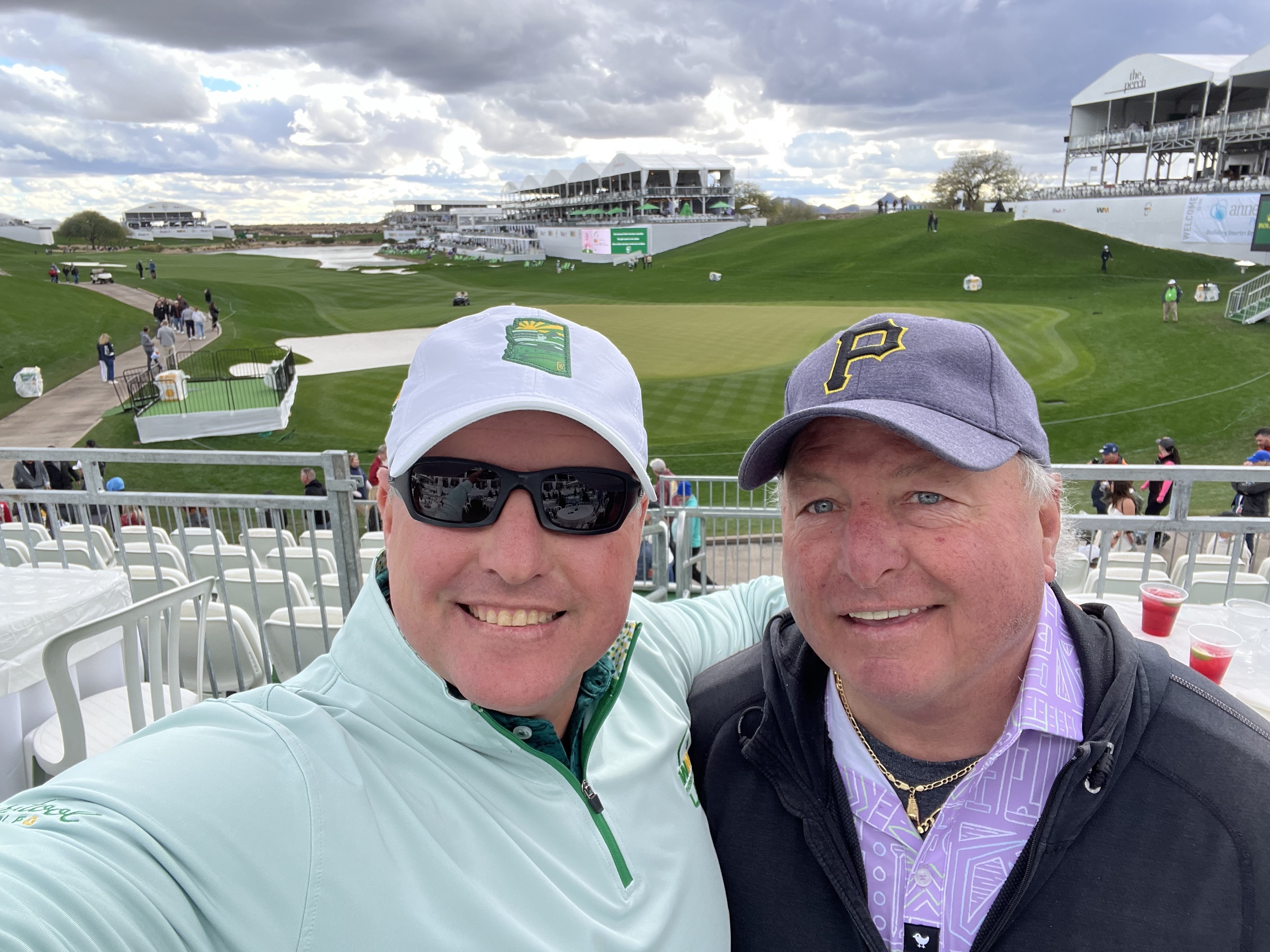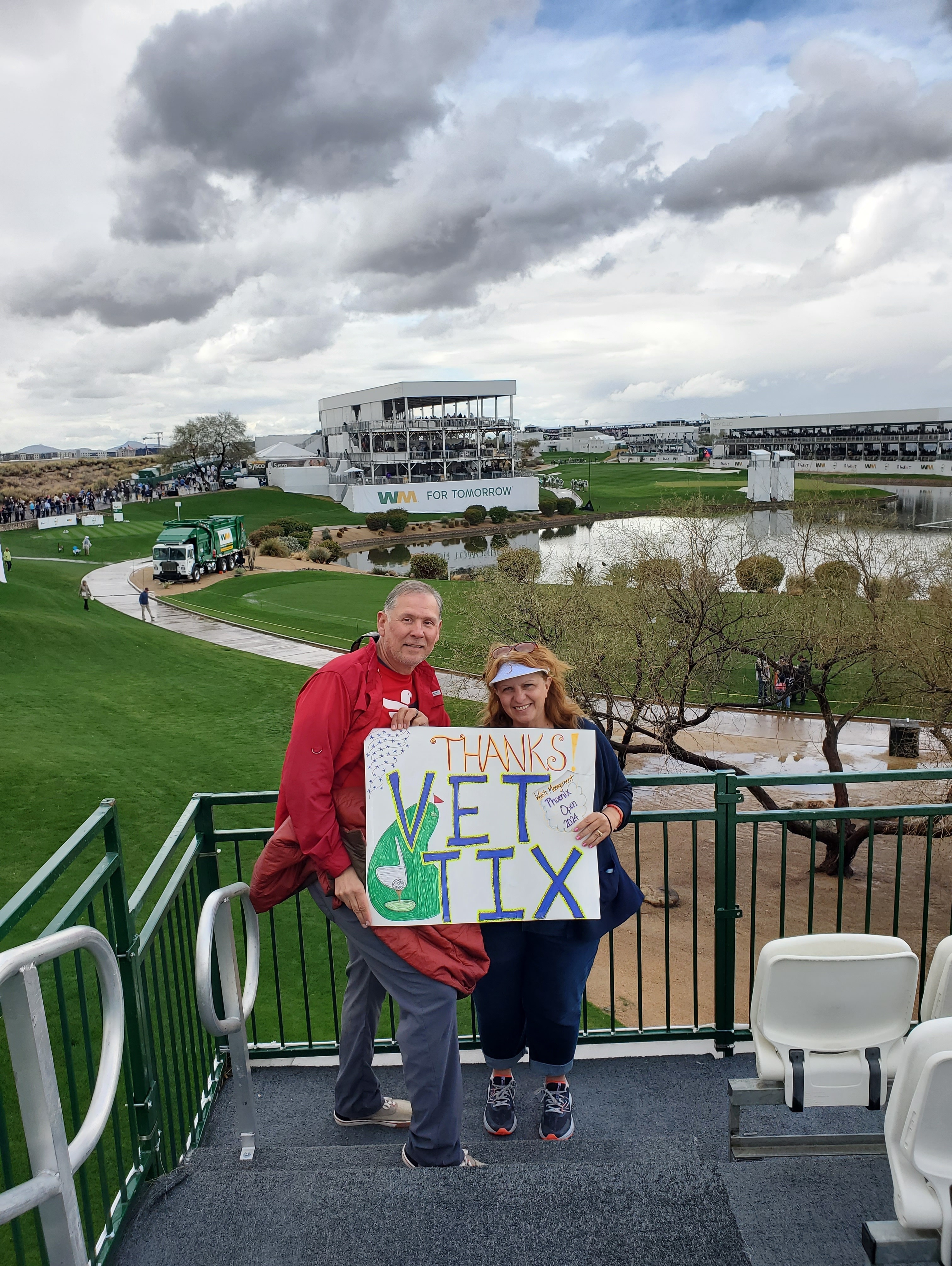 Thank Thunderbirds for providing tickets to Veterans enabling many to easily attend the Waste Management Open. Here I am with my granddaughter at the World Famous WM Phoenix Open16th hole. Everybody at the Patriots Outpost was absolutely wonderful. Despite the rain, hail and wind resulting in the days play being cancelled my granddaughter and I thoroughly enjoyed visiting with other Veterans. Pride of service and banter between them was widespread, all in good humor and brotherhood.