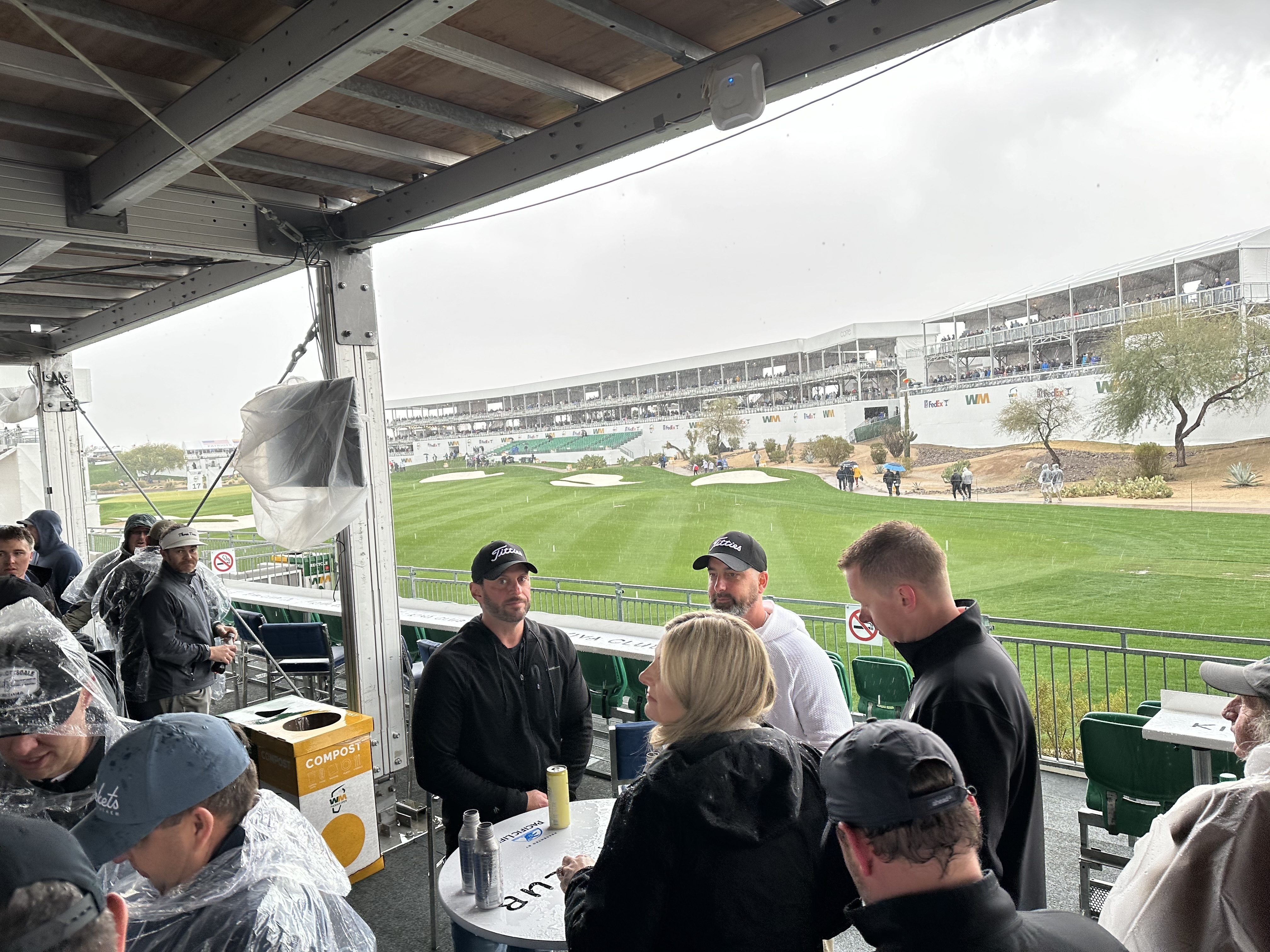 It was a wet day at the Phoenix Open. Our first stop was the tent for Birdies for the Brave on the 18th hole tee box. The large tent housed hundreds escaping the inclement weather. The photo taken was from inside the tent, while we were trying to get weather updates. As bad as the weather was, we had a good time and want to thank those for allowing us to go to the event.