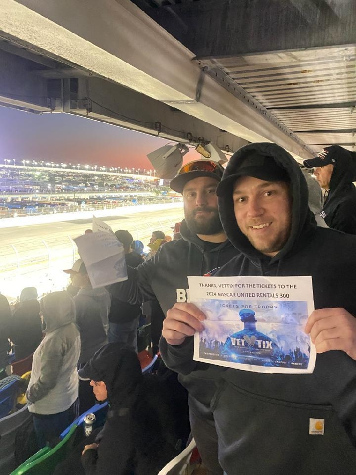 Thanks VetTix for the tickets to the 2024 Nascar United Rentals 300 race this past weekend. We had a great time trying to dodge the rain and the cold but it was a blast.
