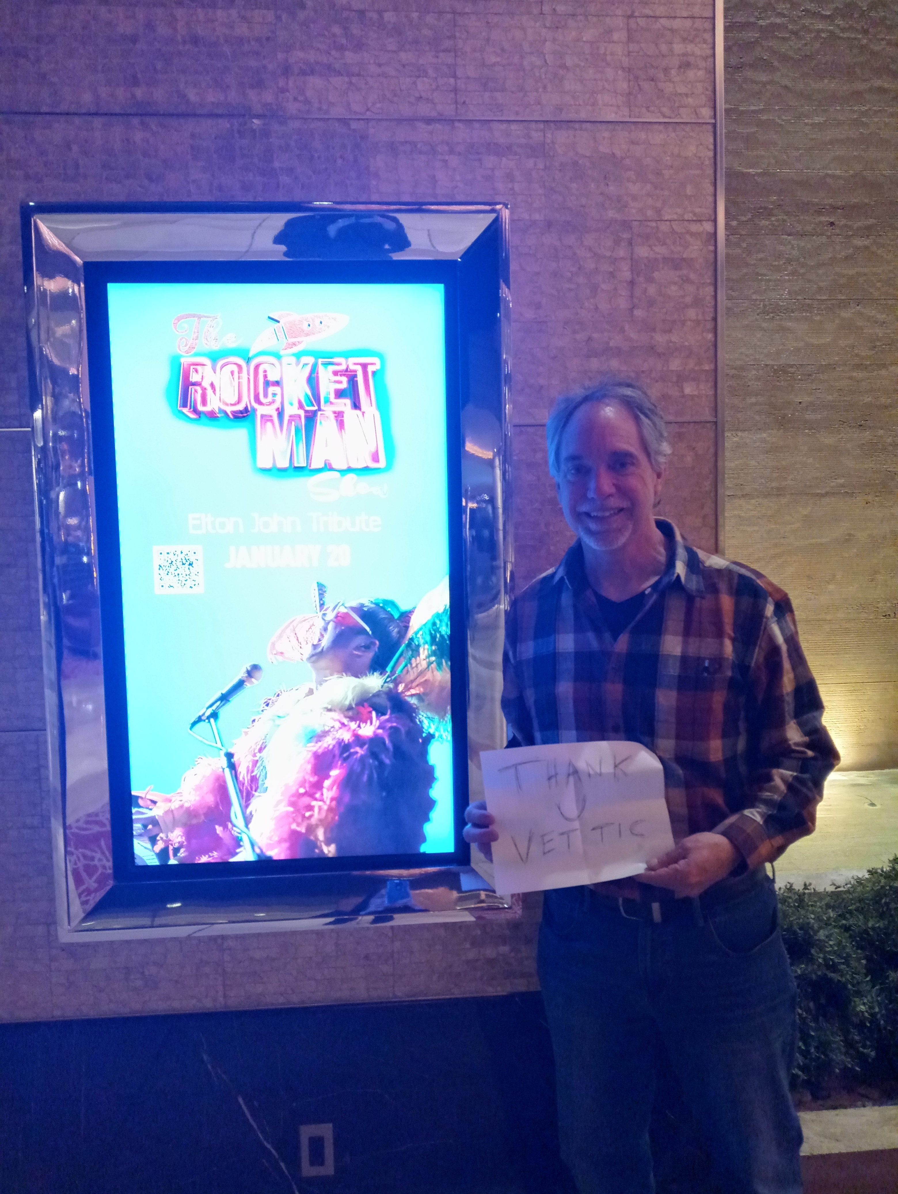 I would like to say Thank you to Penn Entertainment for sponsoring our tickets, M resort and staff, and Rocketman show staff for a great tribute show to Elton John. We have fun! Thank you Vettix for having this show available for us.
