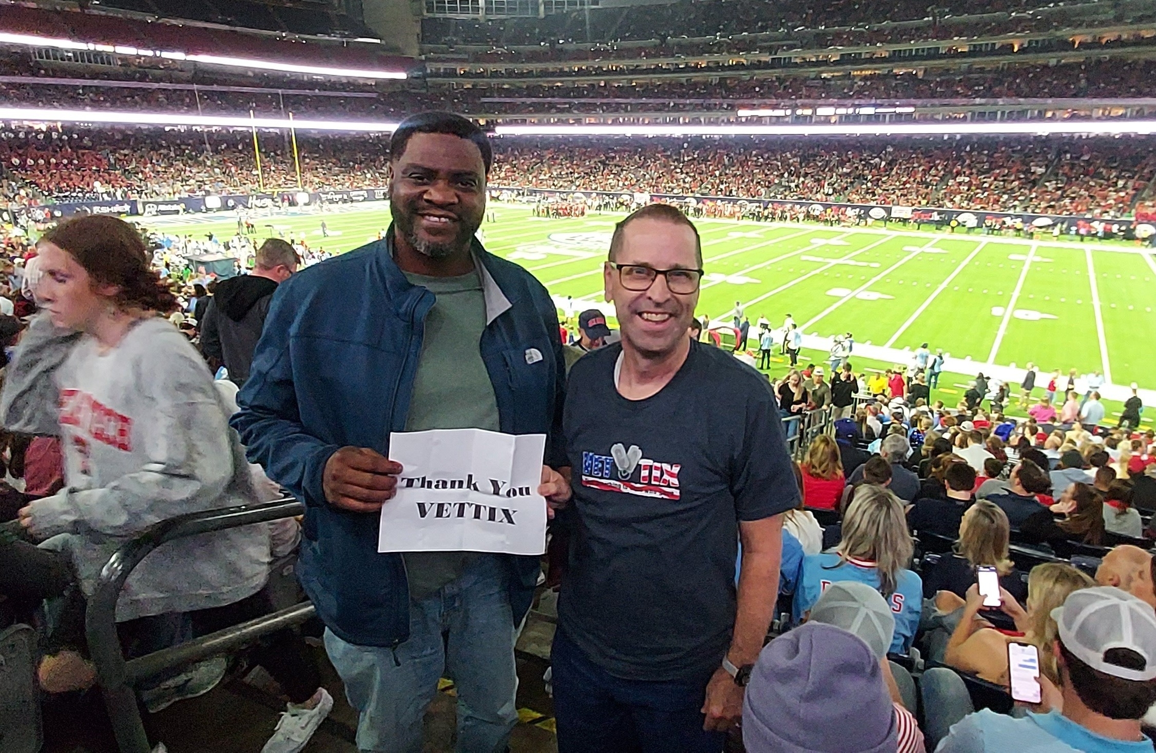 Houston Texans, wow what a venue for a college football game like the Taxact Bowl. Thank you for the donation of tickets to Vettix and respecting us Veterans and like me, still a current Soldier.
