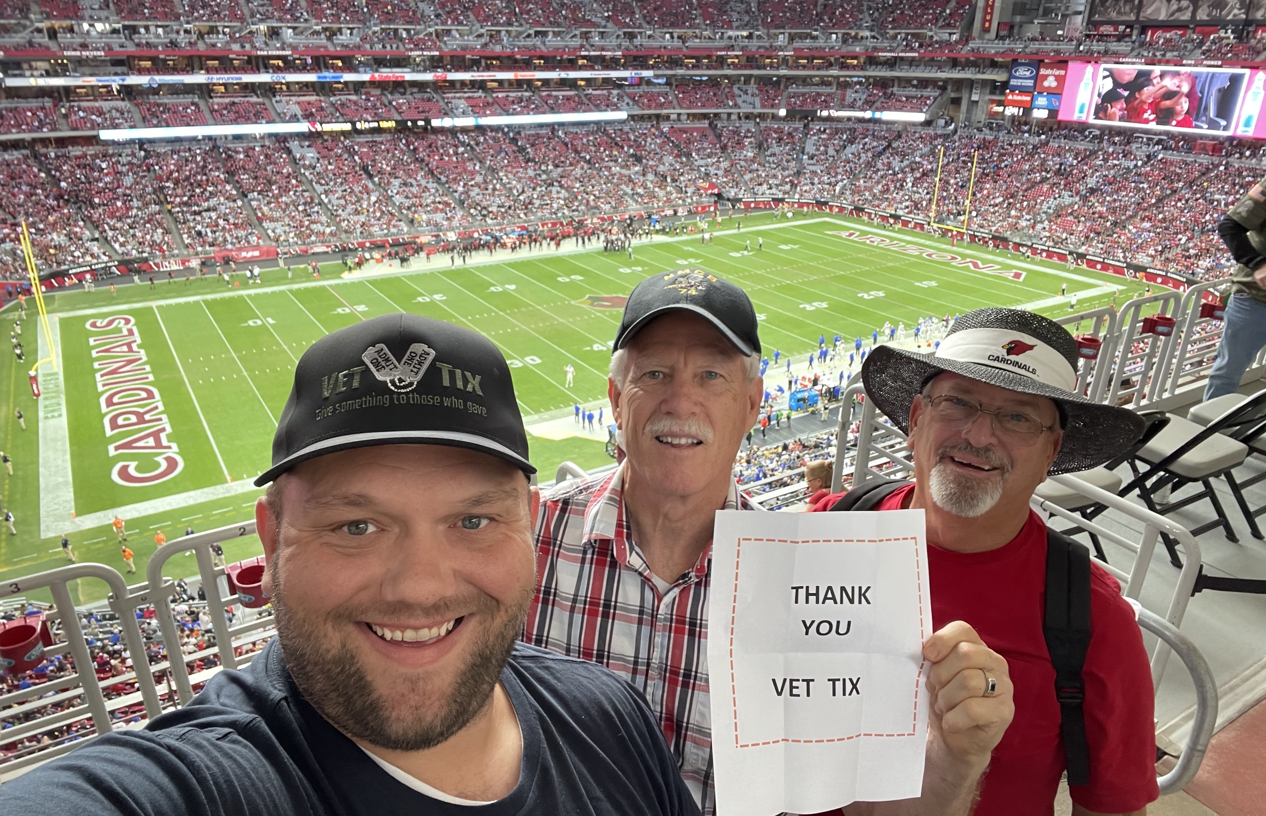 Wow, wow, wow!!!! Thank you for this opportunity. I was able to take 3 guys with me to the Cardinals vs. Rams game at State Farm Stadium. We had such a great time. We couldn’t believe how neat the stadium was and the game was pretty cool too. We hoped the Cardinals scored a little more but it was a great day!!!!