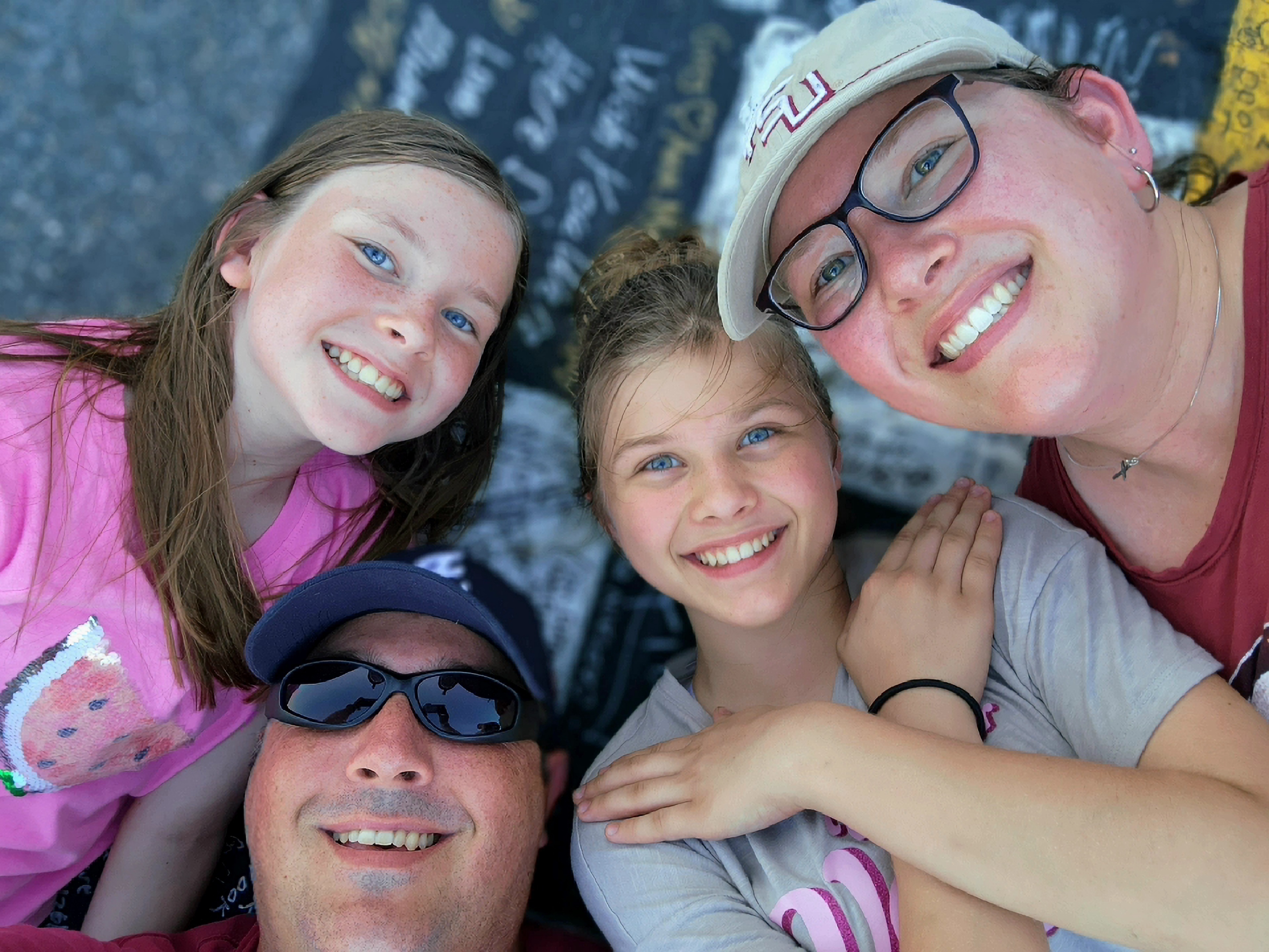I want to express my deepest thanks to the sponsors for their generous ticket donation for the Coke Zero 400! My wife, daughters, and I had an awesome time at the race and it was a very memorable night for us! Already having an entry ticket for the event allowed us to afford the UNOH Fan Zone passes, so we were able to walk out road, the front stretch, and enjoy the pre-race concert close to the stage! (Picture is of us laying on the start/finish line after signing it)